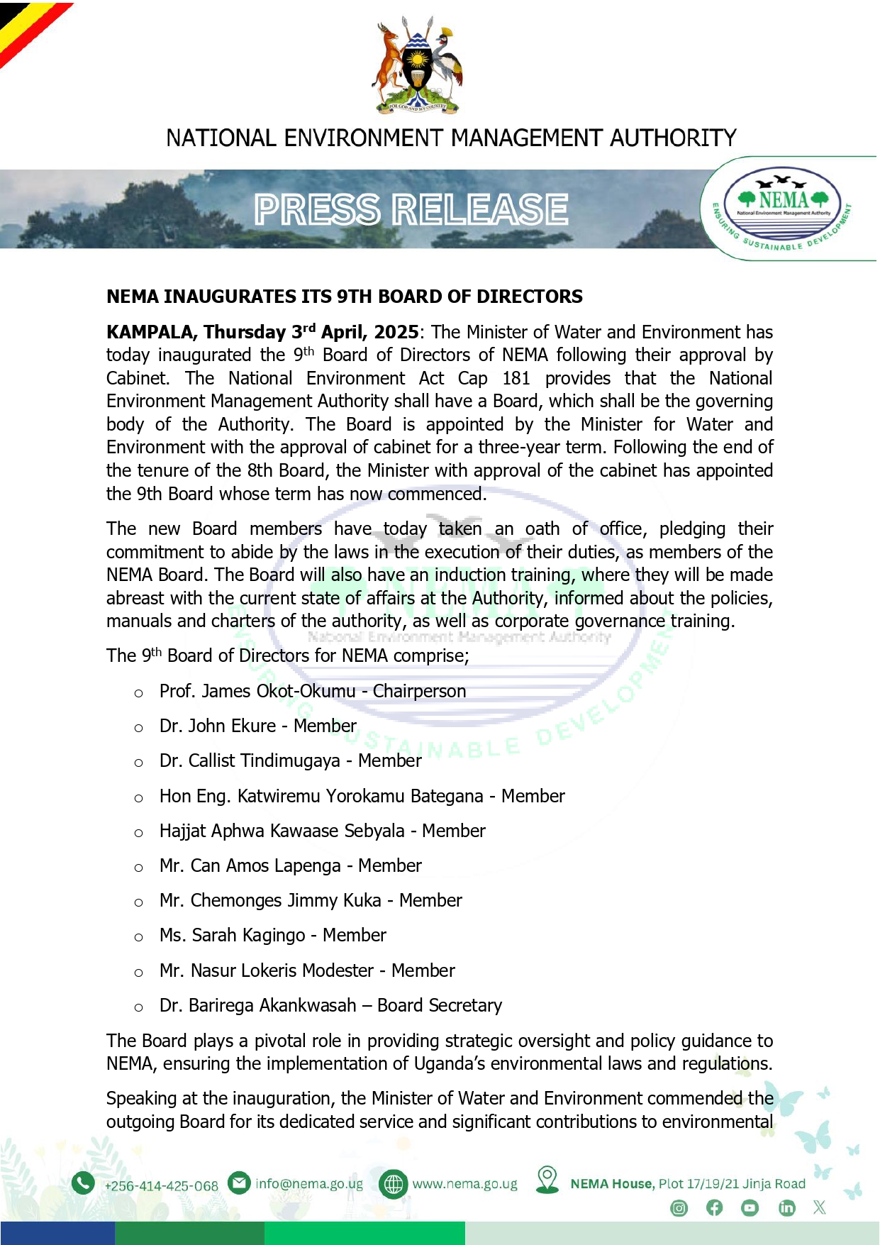 “I’ve been entrusted with the responsibility to lead a new team of directors of NEMA for the next three years. This is, of course, part of the ongoing efforts to enhance environmental management for sustainable development in Uganda. As chairman of the ninth board, I aim to see NEMA function as an efficient institution—one that effectively supports people in sustainable development,” added Prof. Okumu.